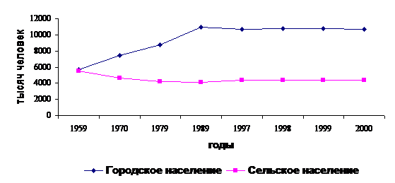 По рисунку видно, что с 1959 до 1989 г. г. численность городского населения росла быстрыми темпами, а численность сельского населения уменьшалась. С 1989 г. численность городского населения стала незначительно снижаться, а сельское население после небольшого повышения стало постепенно снижаться вплоть до 2000г.