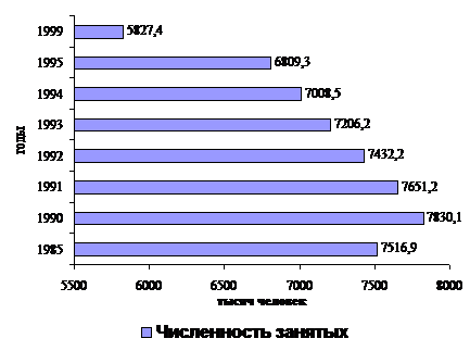 Снижение уровня занятости в 90-х годах отчетливо видно на рисунке 7, построенном на основе данных таблицы 8.