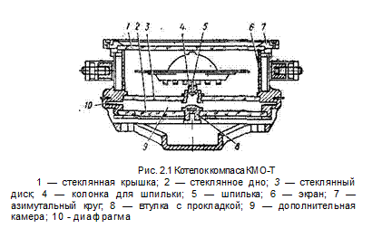 Котелок компаса (рис. 2.1) герметически закрыт сверху и снизу толстыми стеклами на прокладках и заполняется жидкостью, которая представляет собой водный раствор гидролизного технического спирта.