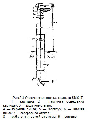 Оптическая система компаса состоит из осветительной лампы, защитного стекла, двух линз, обогревного стекла и зеркала. Некоторые из перечисленных деталей расположены в нактоузе, а некоторые — в металлической трубе под ним.