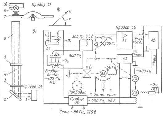 В этом заключается компенсационный метод измерения угла ориентации феррозондового датчика В1 относительно вектора индукции магнитного поля, в котором находится картушка компаса, т. е. определение и дистанционная передача курса судна. Любое изменение курса вызывает появление сигнала Uс, который после усиления вызывает вращение двигателя М1 и отработку ротора В2 на угол, пропорциональный изменению курса судна.
