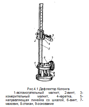 Функцией измеряемой величины Н является расстояние r. На вертикальной планке дефлектора имеется шкала. Магнитная индукция по этой шкале оценивается в условных единицах. Поскольку измеряемая величина обратно пропорциональна кубу расстояния, шкала дефлектора неравномерна.