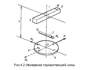 При определенном расстоянии r величина Н компенсирующего поля становится равной величине Н измеряемого поля, и картушка 4 линией NS устанавливается по направлению вектора Н, создаваемого вспомогательным магнитом 3, который закреплен на фиксированном расстоянии от картушки и его ось всегда перпендикулярна оси NS измерительного магнита.