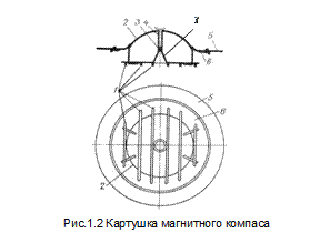 Чувствительный элемент магнитного компаса УКП-М (рис.1.1) представляет собой шестистрелочную магнитную систему (рис.1.2), помещенную в котелок с поддерживающей жидкостью. Чувствительный элемент имеет круговую шкалу для отсчета курса судна. Магнитная система со шкалой называется картушкой магнитного компаса, центрируемой при помощи шпильки.