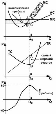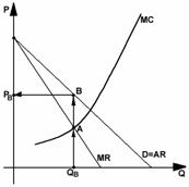На рис. 26 показаны точки равновесия фирмы-монополиста – точка А и точка, в которой прибыль максимизирована – точка В.