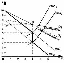 Пример. Пусть МС1 = 5, МС2 = 3,5. По рисунку 34 видно, что цена прода - жи продукта будет равна 7, а объём производства – 14 в обоих случаях.