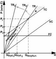 2. Точка безубыточности (имеем нормальную прибыль, однако экономической прибыли нет). Фирма работает только на покрытие собственных затрат (рис. 25б).