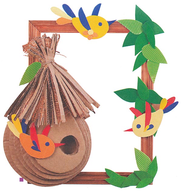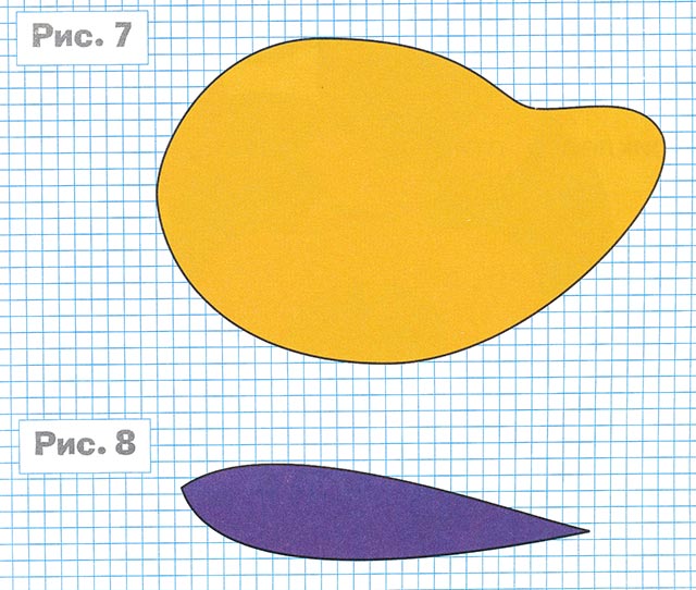 1. Вырежьте по трафарету из гофрированного картона разных цветов тела трёх птиц (рис. 7). Приклейте к ним с изнаночной стороны кусочки толстого картона.