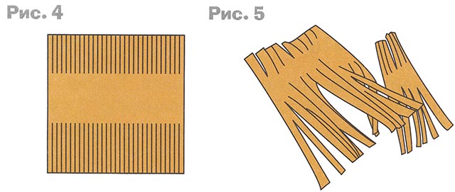 4. Вырежьте кусочек картона 15x15 см и сделайте с двух сторон надрезы разной глубины (рис. 4). Ширина надрезанных полосок 0,5 см. Возьмите картон за неразрезанную часть и присборьте её (рис. 5).