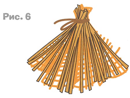 5. Сложите вместе ткань и картон с надрезами, свяжите их, как показано на рисунке (рис. 6). Получилась крыша.