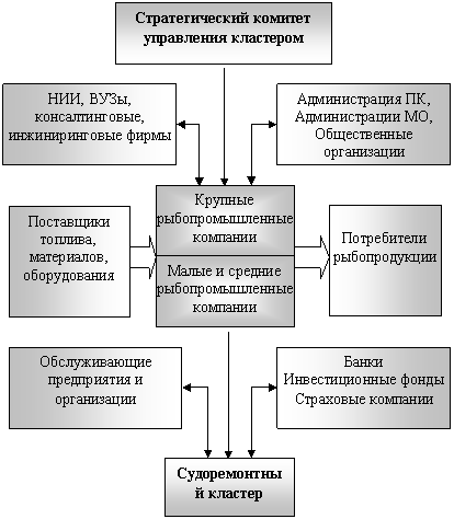 На рис. 7.8 представлена, предлагаемая организационная структура рыбопромышленного кластера Приморского края. Судоремонтные предприятия, расположенные на территории края должны быть объединены в единый судоремонтный кластер. Поскольку они имеют свой, специфический круг поставщиков, обслуживающих предприятий и организаций, научных учреждений и т. д. Рыбопромышленные предприятия являются для этого кластера только одним из потребителей его продукции, хотя и довольно значительным. Взаимодействие между кластерами должны осуществляться на договорной основе.