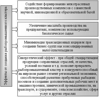 Создание кластера способствует распространению новых технологий, согласованию уровней и стандартов технологии и организации производства в рамках «вертикали действий». Развиваются не только взаимосвязи между фирмами, но и эффективное взаимодействие профилирующей рыбной отрасли с наукой, образованием, влияющее и на стратегию региональных властей. Кластер становится важнейшим центром инновационной активности. Объединение экономических субъектов в кластер позволяет повысить конкурентоспособность предприятий и способствует концентрации капитала [26, с. 46]. При этом следует оценивать кластер как источник не только технических, но и организационных, а также социальных нововведений.