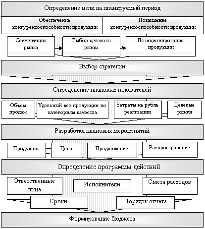 На первом этапе определяется цель организации на планируемый период. В зависимости от положения продукции на рынке это может быть обеспечение конкурентоспособности – для продукции, которая занимает прочное положение или повышение конкурентоспособности – для продукции, теряющей свои позиции. Для этого проводят сегментацию рынка, выбор целевого рынка п позиционирование продукции на нем.