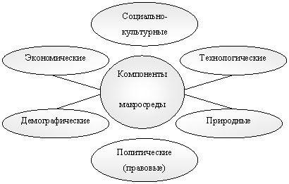 Макросреда - совокупность субъектов и сил, действующих за пределами предприятия, но при этом они могут, как представлять возможности для эффективного функционирования системы, так и создавать угрозы. Основные компоненты макросреды представлены на рис. 6.4.