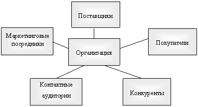 К элементам микросреды следует отнести: само предприятие (его внутреннюю среду), непосредственных конкурентов предприятия по выпускаемым видам продукции; всех поставщиков находящихся на "входе" в систему; маркетинговых посредников фирмы по "входу" и "выходу" системы; потребители; контактные аудитории (кредитные учреждения, средства массовой информации, государственные, общественные организации, контролирующие органы, общественность и внутренние контактные аудитории) (см. рис. 6.5).