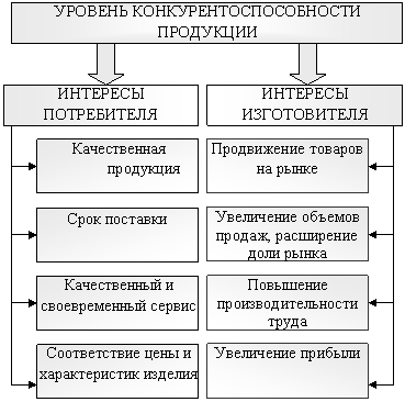 Резюмируя приведенные мнения можно утверждать, что для потребителя качество является обязательной характеристикой, но недостаточной для принятия решения о приобретении данной продукции. Другими словами, конкурентоспособность определяется совокупностью потребительских свойств продукции, необходимых и достаточных для того, чтобы она в определенный момент времени могла быть реализована по сопоставимым ценам на конкретном рынке. Поэтому в обеспечении конкурентоспособности выпускаемой продукции заинтересован как потребитель, так и изготовитель продукции, как это показано на рис.1.1.2.