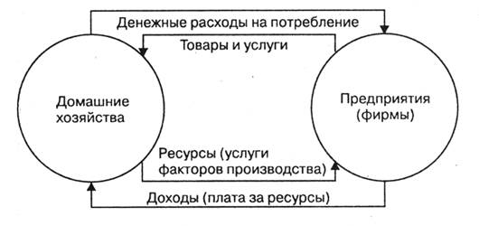 В упрощенной схеме агрегируем «ручейки» и «реки» разнообразных товаров и услуг, расходов и доходов в однородные «потоки», протекающие между предприятиями и домашними хозяйствами, объединяющие их в хозяйственную систему (рис.1).