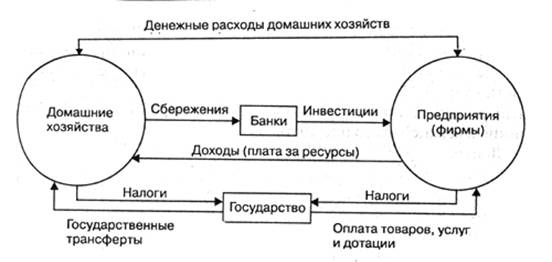 На рис.2 показано, что государство собирает налоги с населения (домашних хозяйств) и предприятий, формируя тем самым доходную часть государственного бюджета. Расходные статьи государственного бюджета включают покупку товаров и услуг (для нужд обороны и строительства дорог, поддержки государственных предприятий и содержания учреждений), выплаты домашним хозяйствам социальных трансфертов, т. е. безвозмездные выплаты ] субсидий, пособий, пенсий, стипендий.