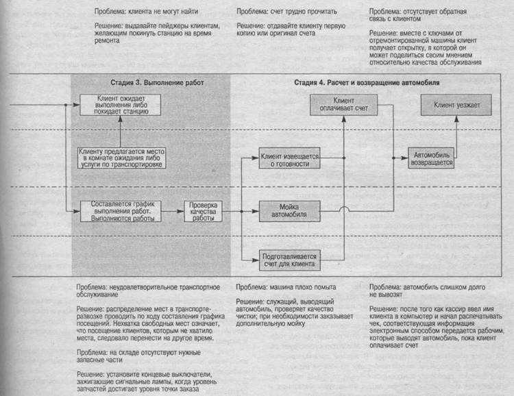 В блок-схему включены все операции, составляющие типичный сервисный процесс на предприятии данного типа. Чтобы более четко отобразить, кто именно выполняет ту или иную операцию, на блок-схеме показаны уровни. На самом верхнем уровне расположены операции, выполняемые клиентом. Далее следуют операции, которые выполняются менеджером, но контролируются клиентом. На третьем уровне расположены операции, выполняемые в гараже, а на самом нижнем четвертом — внутрифирменные учетно-бухгалтерские операции.