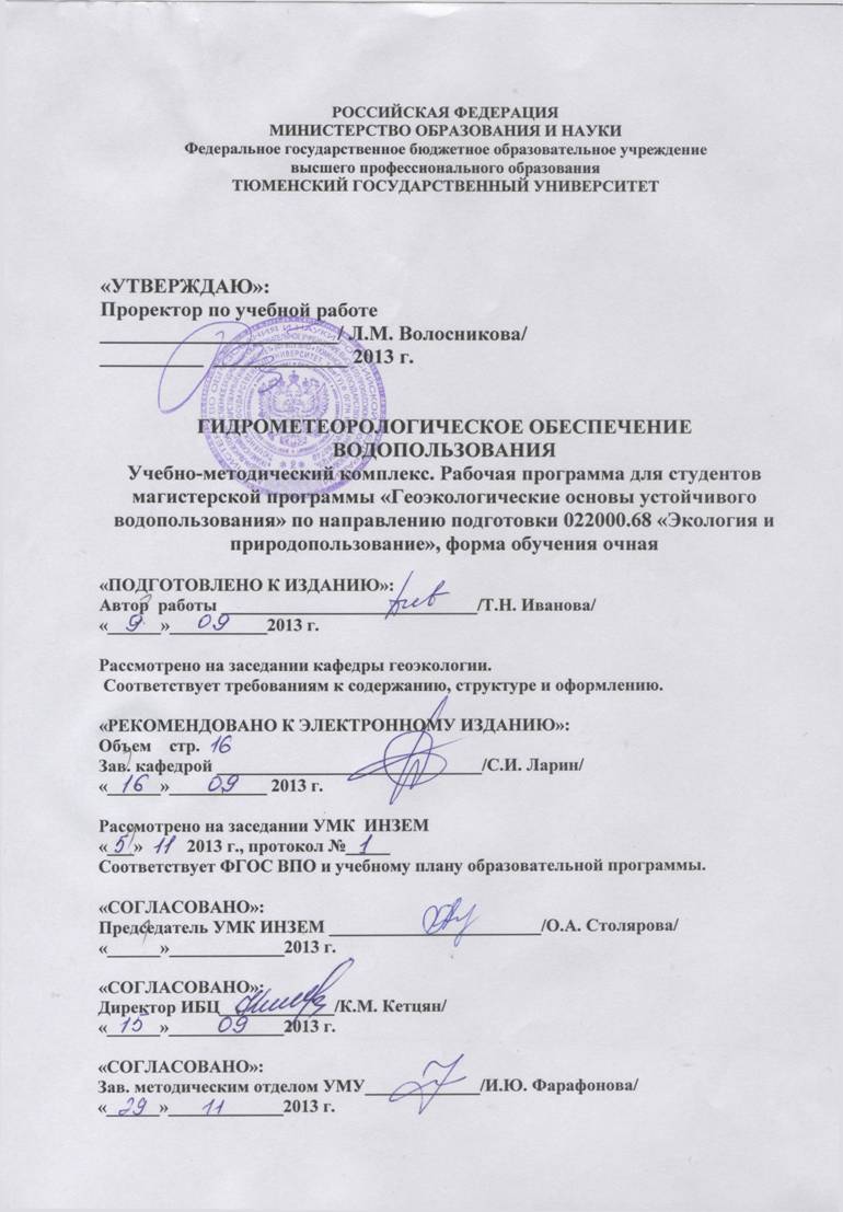 Иванова обеспечение водопользования. Учебно-методический комплекс. Рабочая программа для студентов магистерской программы «Геоэкологические основы устойчивого водопользования» по направлению подготовки 022000.68 «Экология и природопользование», форма обучения очная. Тюмень, 2013, 16 стр.