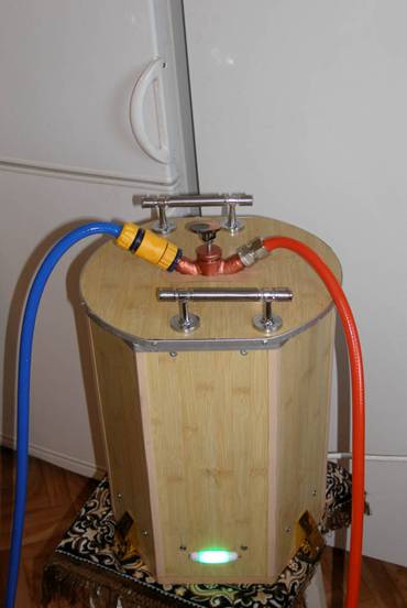 Этот нагреватель является доработанным вариантом Бойлерона-6 с отсутствующими колебаниями температуры при работе и предназначен для подключения к водопроводному крану. Нововведением является также яркая световая индикация режима нагрева, что облегчает контроль его окончания. Основные особености его таковы: