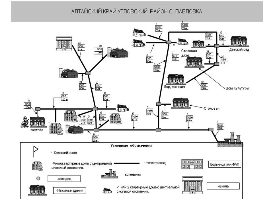 3.1.1. Схема теплоснабжения с. Павловка с нанесением источников тепловой энергии с магистральными тепловыми сетями по существующему состоянию.