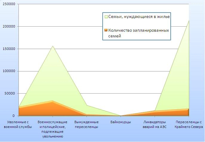 - 157 тысяч семей военнослужащих и сотрудников органов внутренних дел, подлежащих увольнению с военной службы (службы), в том числе подлежащих отселению из закрытых военных городков и поселков; 20 тысяч семей граждан, уволенных с военной службы (службы), вставших до 1 января 2005 г. на жилищный учет; 1001 семья Россиян, выселяющихся с комплекса "Байконур"; 12,6 тысяч семей граждан, принимавших участие в ликвидации последствий радиационных аварий и катастроф; 24,3 тысячи семьи вынужденных переселенцев; 214 тысяч семей граждан, выезжающих из районов Крайнего Севера.