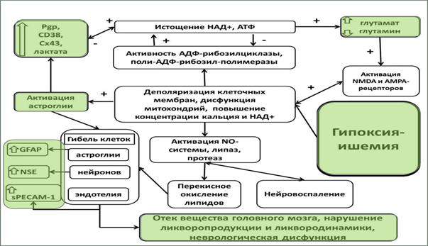 Рисунок - 3 Молекулярно-клеточные изменения при гипоксически-ишемическом поражении ЦНС («+» - стимулирующее влияние, «-» - ингибирующее влияние), цветом выделены собственные исследования