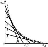 1–5 – зависимости wrA(xA) для температур Т1, Т2, T3, Т4, Т5 (T1<Т2<Т3<<Т4<Т5);