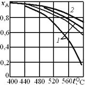 При решении практических задач линию оптимальных температур часто строят в координатах хА – Т. Тогда это линия, абсциссы точек которой – температуры, обеспечивающие максимальную скорость реакции для степеней превращения, являющихся ординатами этих точек. Для построения такой кривой можно воспользоваться уравнением типа (6.30). На рис. 6.12 приведена линия оптимальных температур для процесса окисления диоксида серы на ванадиевом (V2O5) катализаторе при составе исходной газовой смеси (в объемных долях, %) 7 % SO2 и 11 % О2. Линии 2 отвечают условию, когда скорость реакции составляет 80 % максимальной.