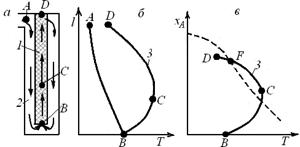 Рабочая линия процесса, характеризующая изменение температуры с ростом степени превращения (кривая 3) на участке BCFD, близка к линии оптимальных температур (штриховая линия). Однако указанные выше требования по условиям теплообмена в таком реакторе соблюдаются слабо. Действительно, на участке ВС скорость тепловыделения максимальна, и нужно отводить много теплоты. В то же время скорость теплоотвода здесь мала, так как невелика движущая сила теплопередачи (∆T). На участке FD теплоты выделяется сравнительно немного, но по наружной трубке идет холодный газ, ∆Т велика и скорость теплоотвода выше необходимой. В какой-то степени этот недостаток можно устранить в аналогичных реакторах с двойными теплообменными трубками (см. рис. 6.16).