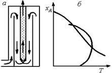 и зависимости хА(Т), характеризующие процесс в нем (б)