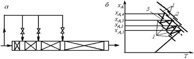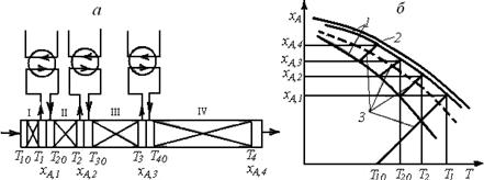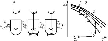 Рис. 6.19. Схема каскада реакторов идеального смешения с отводом теплоты в секциях каскада (а) и зависимости хА(Т), характеризующие процесс в нем (б) (обозначения те же, что и на рис. 6.17)