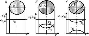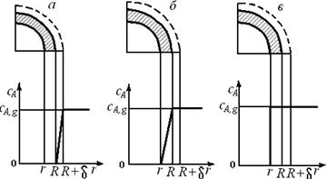 На рис. 7.4, а приведен профиль изменения концентрации газообразного реагента, отвечающий протеканию процесса во внешнедиффузионной области. Так как при этом стадии, следующие за диффузией реагента А через пограничную газовую пленку, не оказывают сопротивления дальнейшему проникновению А через слой твердых продуктов реакции и взаимодействию с ядром реагента В, то можно принять, что концентрация cA,s реагента А на поверхности твердой частицы равна нулю.