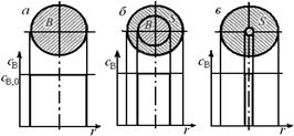 протекания гетерогенного процесса, описываемого моделью с фронтальным перемещением зоны реакции: а – до реакции; б – в промежуточный момент реакции; в – почти полностью превращенная частица