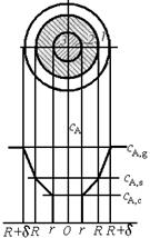 концентрация газообразного реагента А у поверхности твердой частицы ниже, чем в ядре газового потока. Нельзя точно установить пространственное расположение границы, на которой начинается снижение концентрации газообразного реагента, так как при постоянном обтекании частицы газообразным потоком могут происходить колебания этой границы. Однако условно можно принять, что граница проходит на некотором расстоянии δ от поверхности твердой частицы. Тогда можно условно зафиксировать поверхностную газовую пленку толщиной δ, характеризующуюся тем, что за ее пределами концентрация газообразного реагента постоянна и равна cA,g (индекс «g» – gas), а внутри пленки сА уменьшается от сА,g до концентрации на поверхности твердой частицы cA,s (индекс «s» – от англ. surface – поверхность).