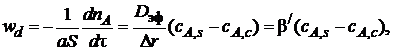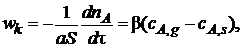 где wk – скорость конвективной диффузии, т. е. количество газообразного реагента А, перенесенное вследствие конвективной диффузии через единицу поверхности в единицу времени; β – коэффициент массоотдачи, зависящий от гидродинамики потока.