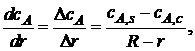 Так как слой твердых продуктов реакции представляет собой определенное сопротивление переносу реагента А из пограничной газовой пленки к поверхности ядра, то концентрация этого реагента по мере движения к поверхности ядра будет уменьшаться от cA,s на внешней поверхности твердой частицы до сА,с (индекс «с» от англ. core – ядро) на поверхности ядра (см. рис. 7.3).
