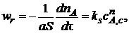 При проведении количественных расчетов следует иметь в виду, что так как скорость поверхностной реакции измеряется количеством вещества, расходуемого в единицу времени на единице реакционной поверхности, например кмоль/(м2∙ч), то это отразится на единицах измерения константы скорости ks