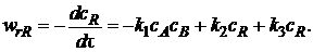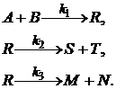 Эта реакция состоит из трех стадий. Вторая и третья стадии являются последовательными по отношению к первой и параллельны по отношению друг к другу. Скорость по компоненту R, участвующему во всех трех реакциях,