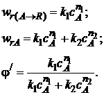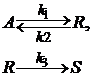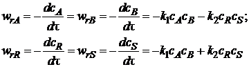 характеризующиеся значениями констант скорости k1 = 10–3 с–1, k2 = 10–2 с–1. Перед началом реакции сA,0 = 2 кмоль/м3, cR,0 = CS,0 = 0. Определите значения скорости химической реакции по исходному реагенту А (w > rА) и продукту S в момент времени, когда cR = 0,05 кмоль/м3, CS = 0,5 кмоль/м3.