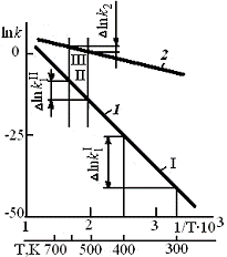 При изменении температуры от 500 до 600 К скорость первой реакции (Е = 165 кДж/моль) увеличивается в 820 раз (участок II), а скорость второй реакции (E = 40 кДж/моль) – лишь в 5,3 раза (участок III).