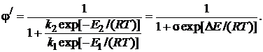 Пренебрегая слабым влиянием температуры на предэкспоненциальные множители в уравнении Аррениуса, считаем, что σ = k2,0/k1,0 от температуры не зависит. Производная положительна, если ∆Е=Е1–Е2>0, и отрицательна, если ∆Е < 0: