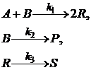 при температуре, когда константы скоростей отдельных элементарных реакций имеют следующие значения: k1 = 0,02 м3/(кмоль·с), k2 = 0,0015 с–1, k3 = 0,0028 c–1. Начальный состав реакционной смеси: сА,0 = 0,1 кмоль/м3, сB,0 = 0,3 кмоль/м3, cR,0 = cS,0 = сР,0 = 0. В реакторе установились концентрации продуктов: cR = 0,028 кмоль/м3, ср = 0,05 кмоль/м3; степень превращения исходного реагента хА = 0,2. Определите значения скоростей химической реакции по веществам R и Р.