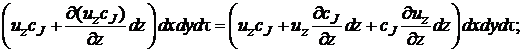 Количество вещества, попадающее за время dτ в элементарный объем с конвективным потоком, можно рассматривать как сумму составляющих потока, которые войдут через отдельные грани параллелепипеда. В направлении оси z через грань dx dy за время dτ войдет cJ иz dx dy dt моль вещества J.