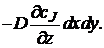 Аналогично получим член уравнения материального баланса, описывающий изменение количества вещества J в результате диффузионного переноса. Диффузионный поток на входе в параллелепипед через грань dxdy (в направлении оси z) в соответствии с первым законом Фика равен