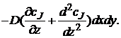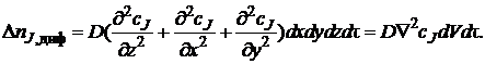 При прохождении потока через элементарный объем произойдет изменение градиента концентрации dcJ/dz на величину (d2cJ /dz2)dz, следовательно, диффузионный поток на выходе из параллелепипеда через противоположную грань составит