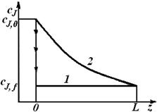 Как видно из примеров 5.1 и 5.2, при одинаковых условиях проведения одной и той же реакции для достижения равной глубины превращения среднее время пребывания реагентов в проточном реакторе идеального смешения больше, чем в реакторе идеального вытеснения. Этот факт легко может быть объяснен характером распределения концентрации реагентов по объему указанных реакторов. Если в проточном реакторе идеального смешения концентрации во всех точках равны конечной концентрации (рис. 5.6, линия 1), то в реакторе идеального выяснения в двух соседних точках на оси реактора концентрации реагентов уже отличаются (линия 2). Например, в соответствии с уравнением (5.12) в случае реакции первого порядка (wrA = kсА) формула распределения концентрации реагента А по длине реактора идеального вытеснения имеет вид
