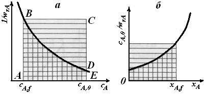 т. е. величина B как определенный интеграл выражается геометрически площадью криволинейной трапеции, ограниченной прямыми cA = cA,f, cA = cA,0, графиком функции l/wrA = f(cA) и осью абсцисс (см. рис. 5.7, а). Или в соответствии с уравнением (5.7), площадью криволинейной трапеции, ограниченной прямыми хА = 0, хА = xA,f графиком функции l/wrA = f(хА) и осью абсцисс (см. рис. 5.7, б).