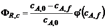 Дифференциальная селективность φ', стоящая под знаком интеграла, является в общем случае убывающей или возрастающей функцией концентрации исходного реагента А, и в том случае, если концентрация сА не постоянна, для определения ФR нужно провести интегрирование этой функции. В частности, такую операцию необходимо сделать при расчете выхода продукта R в реакторе идеального вытеснения. Если сА постоянна по объему реактора и во времени (в стационарном реакторе идеального смешения), то и дифференциальная селективность φ' будет характеризоваться постоянным числовым значением, следовательно, уравнение (5.16) для реактора идеального смешения можно упростить: